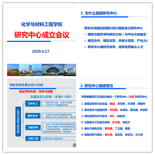 会上,东为富院长分析了组建研究中心的必要性,指出组建中心的目的是为了更好的凝练与聚焦学科研究方向,通过各团队间相互合作、相互支撑,共同谋划承担大项目、产出大成果,成立中心可更好地发挥传帮带作用,培养优秀拔尖人才。东院长对研究中心的组建情况进行了说明,学院有条件的科研团队先行组建了6个研究中心,分别是:表面活性剂与化妆品、纳米复合与能源材料、绿色涂料科学与技术、功能高分子及复合材料、催化与绿色反应、智能材料与催化等研究中心,结合学院学科发展定位与目标,各研究中心明确了重点考核任务和未来发展方向,公布了中心考核与奖惩条例。随后,各团队负责人对成立研究中心各抒己见,更好地完善和补充了中心建设制度。