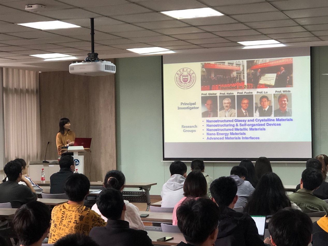 此次报告会由洪流副教授主持,会间吉庆敏教授主要向参加报告会的师生们介绍了她在富勒烯聚集体构效关系研究中取得的显著科研成果,并着重向在场师生详细介绍了其课题组在富勒烯溶液自组装领域取得的最新进展和突破。利用溶液法调控富勒烯自组装过程是制备富勒烯超分子结构的重要和主要方式。然而,由于分子间的强π-π作用,富勒烯分子在溶液中的自组装过程往往极快完成,因而难以实现对富勒烯超分子结构在纳米尺度上的微观调控。通过在富勒烯的溶液自组装过程中掺杂不同π系分子,能够实现对其聚集体在纳米结构特征上的调控以及功能化,并制备出具有不同结构特征的多孔碳结构,展现出强化的能源存贮和光电特性。同时,通过调控复合富勒烯在溶液中的自组装结构,对于富勒烯自组装机理也获得了进一步深入的解析。吉庆敏教授精彩的演讲引起广大师生的兴趣,现场反响热烈。会后,吉教授与在场的师生就相关学术问题进行了热烈的讨论与交流。