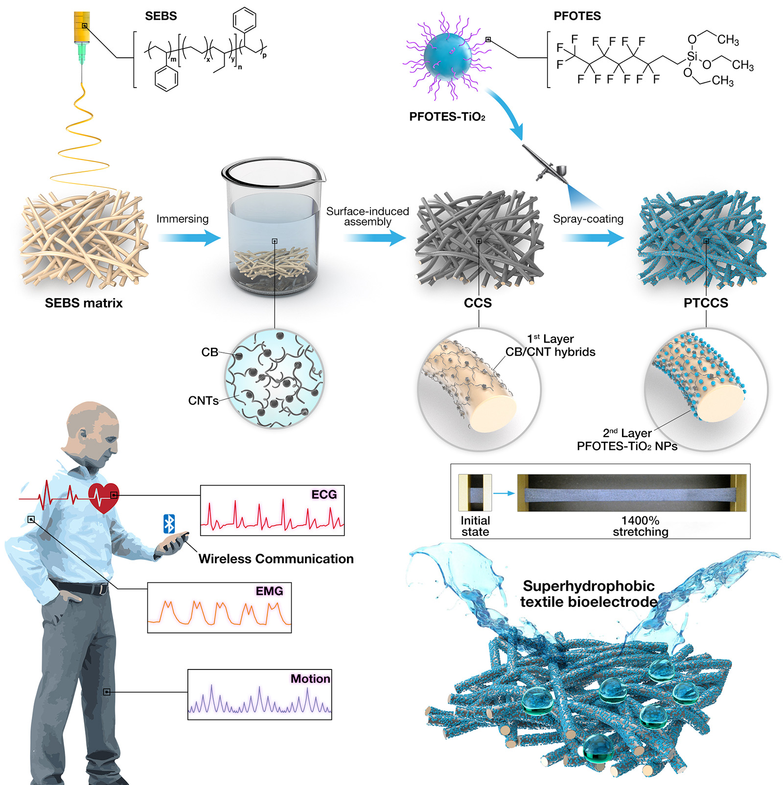 鉴于此,多宝体育官网 的刘天西教授、黄云鹏副教授与英国伦敦大学学院(University College London)的Ivan P. Parkin教授合作,以高弹性、低杨氏模量、透气透湿的静电纺SEBS弹性体织物为基材,将廉价、高导电性的炭黑/碳纳米管(CB/CNT)杂化导电材料负载于弹性基体以构筑0D-1D杂化导电层,接着将全氟辛基三乙氧基硅烷改性的TiO2纳米颗粒(PFOTES-TiO2NPs)负载于导电层表面,内层自适应、耐形变的CB/CNT杂化导电网络可以在超高拉伸下(>1000%)维持稳定的导电通路,而具有微纳结构和低表面能的外层PFOTES-TiO2NPs能够为导电织物提供超疏水表面。基于此,本工作成功地构筑了一种超可拉伸、具备优异健康监测性能和出色自清洁能力的织物基表皮电极,在作为可穿戴应变传感器时,其具有1050.0%的超宽检测范围和高达1134.7的应变系数。应用于生理电信号监测时,该织物电极能够实时、精确地传输人体心电(ECG)和肌电(EMG)信号。此外,该织物电极还具有极好的自清洁性能,以及对多种腐蚀性液体甚至机械损伤的耐受能力,确保了其在恶劣环境下的性能稳定性。因此,这项研究为开发高性能、可舒适穿戴的表皮电子器件提供了新途径。