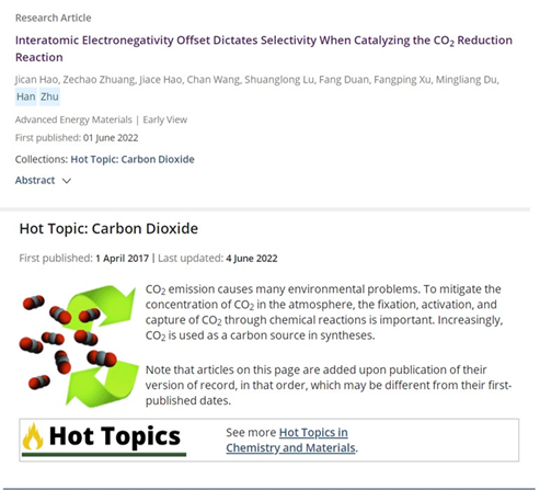 近期,江南大学化工学院杜明亮教授团队在面向碳中和高效催化转化材料的设计与应用方面取得重要进展,课题组2018级博士生郝继璨以第一作者在Advanced Energy Materials上发表重要学术论文:“Interatomic Electronegativity Offset Dictates Selectivity When Catalyzing the CO2Reduction Reaction(Adv. Energy Mater. 2022, 2200579)”,通讯作者为朱罕副研究员。同时,该工作被欧洲化学会旗下期刊ChemSusChem作为Hot Topic(Carbon Dioxide)重点报道。