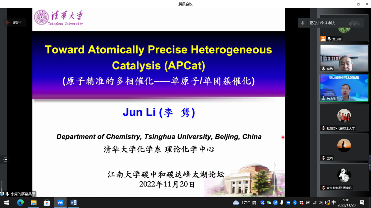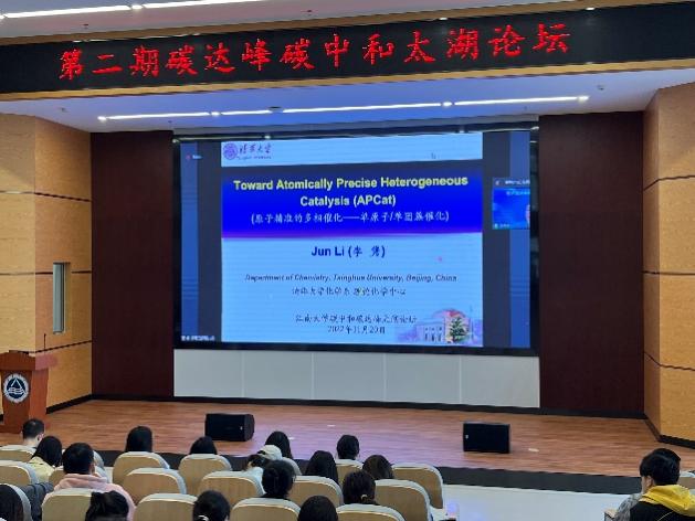 2022年11月20日,由江南大学、中国感光学会光催化专业委员会设立的“碳达峰碳中和太湖论坛”第二期学术报告会顺利在我校举行。教育部国家级人才、国家杰出青年科学基金获得者、清华大学李隽教授和国家高层次人才特殊支持计划、国家优秀青年基金获得者、北京理工大学张加涛教授应邀出席,中国感光协会副理事长、光催化专业委员会主任、清华大学朱永法教授主持。第二期报告会采用线上线下结合的方式,在我校蠡湖校区和宜兴研究生院分别设立集中会场,多宝体育 院长东为富教授、副院长董玉明教授以及相关师生共计300多人参加。