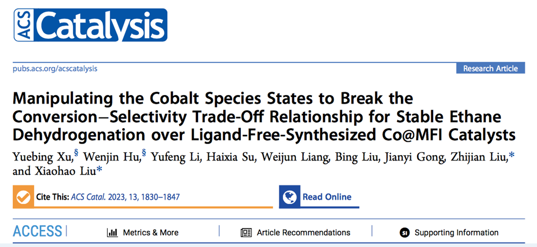 近日,我校化工学院刘小浩教授团队在开发非贵金属催化乙烷无氧脱氢高效制乙烯的研究中取得重要进展,研究成果以“Manipulating the Cobalt Species States to Break the Conversion-Selectivity Trade-Off Relationship for Stable Ethane Dehydrogenation over Ligand-Free-Synthesized Co@MFI Catalysts”为题发表于催化领域顶级期刊《ACS Catalysis》上(DOI: //doi.org/10.1021/acscatal.2c05860)。该论文江南大学化工学院胥月兵副教授和硕士研究生胡文金为共同第一作者,中国石化催化剂有限公司刘志坚教授和江南大学刘小浩教授为共同通讯作者。