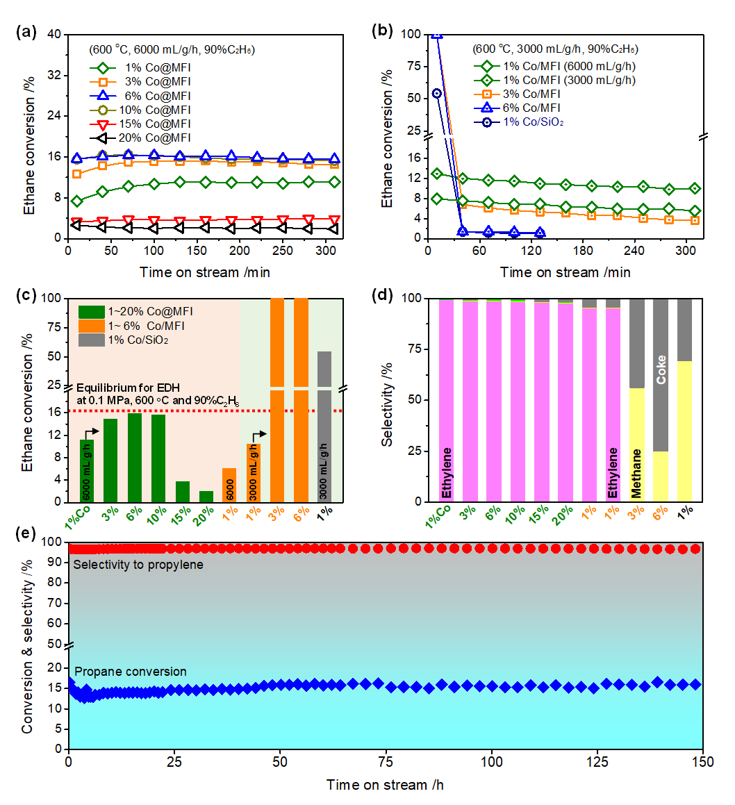 图2. Co@MFI催化乙烷(丙烷)无氧脱氢制乙烯(丙烯)反应性能结果