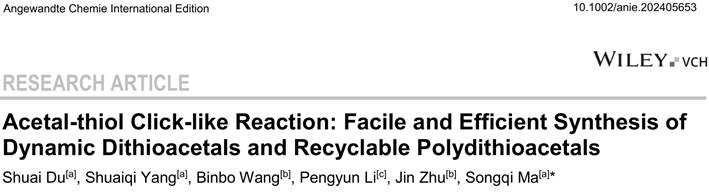 该研究为绿色高效合成二硫缩醛和可回收聚二硫缩醛提供了一种有前景的类点击反应,有利于有机化学、高分子化学、材料化学和药物化学等领域的可持续发展。该工作以“Acetal-thiol Click-like Reaction: Facile and Efficient Synthesis of Dynamic Dithioacetals and Recyclable Polydithioacetals”为题发表在《Angew. Chem. Int. Ed.》上(Angew. Chem. Int. Ed. 2024, e202405653)。文章第一作者是多宝体育 博士生杜帅。该研究得到国家自然科学基金委的支持。