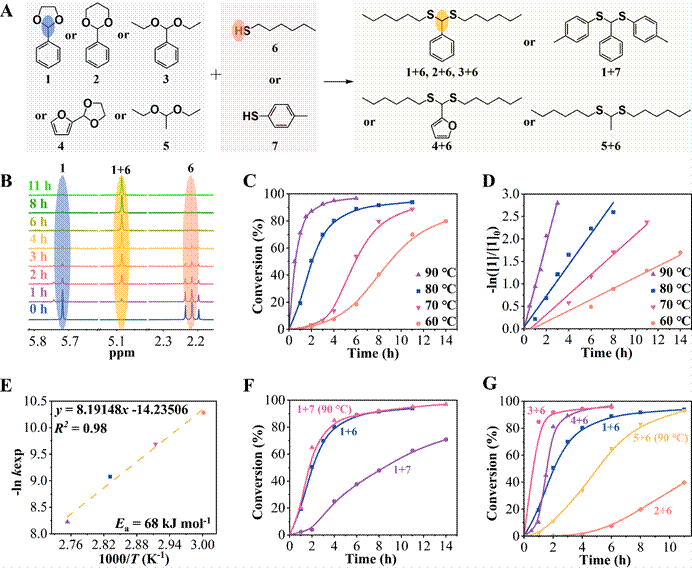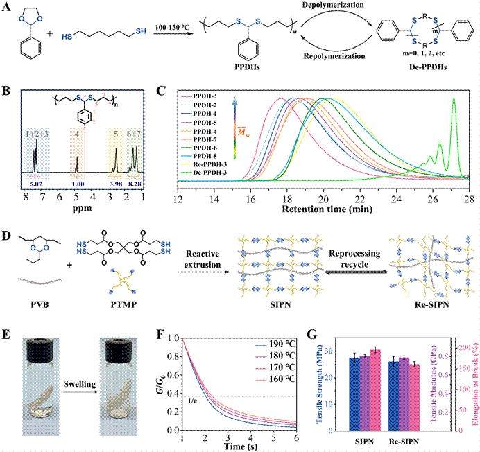 近期,多宝体育官网 马松琪教授团队报道了一种无催化剂和无溶剂的缩醛-硫醇类点击反应,用于合成二硫缩醛和聚二硫缩醛。可实现缩醛-硫醇的高转化率,高于同条件下酸催化的缩醛-硫醇反应。通过选用系列具有代表性结构的线性缩醛和环状缩醛(包括可再生的生物基衍生物呋喃缩醛)与脂肪类和芳香类硫醇的反应,证明了缩醛-硫醇在无催化剂和无溶剂下具有较高的反应转化率和普适性。经过对典型缩醛-硫醇不同温度下的反应动力学监测,发现反应符合准一级反应动力学。结合实验和密度泛函理论计算,证明反应遵循SN1反应机理,即巯基质子化缩醛(活化),进而产生碳正离子,被硫醇亲核攻击,生成S,O-缩醛,最终生成二硫缩醛。随后,我们利用该反应合成了易于回收的聚二硫缩醛。通过简单的加热和搅拌,以缩醛和二硫醇为原料,合成了MW最高为110 kDa的线性聚二硫缩醛,解聚得到大环二硫缩醛,再聚合得到聚二硫缩醛;以聚乙烯醇缩丁醛(PVB)和四(3-巯基丙酸)季戊四醇酯(PTMP)为原料,通过双螺杆挤出机反应挤出,制备了力学性能优良、可连续再加工的半互穿聚合物动态网络。回收后的半互穿网络的性能与原半互穿网络相当。