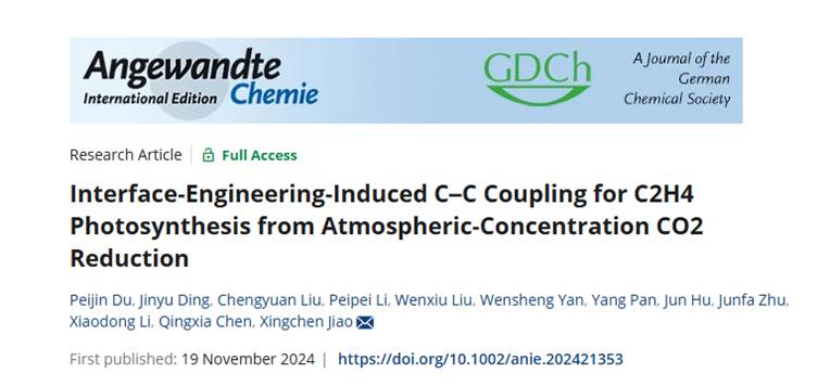 焦星辰教授、陈庆霞副教授与马普所李小东博士合作,在光催化CO2还原制C2燃料方面取得重要进展,相关工作在“Angew. Chem. Int. Ed.”上发表:Interface-Engineering-Induced C–C Coupling for C2H4 Photosynthesis from Atmospheric-Concentration CO2Reduction。该论文化工学院2023级硕士研究生杜佩津、2022级硕士研究生丁金钰为共同第一作者。