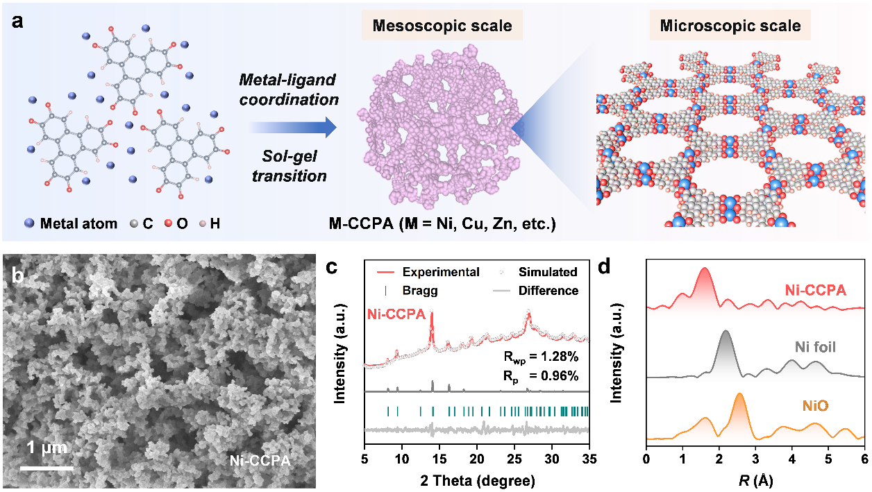 图1:共轭配位聚合物气凝胶催化剂的制备流程和结构表征结果