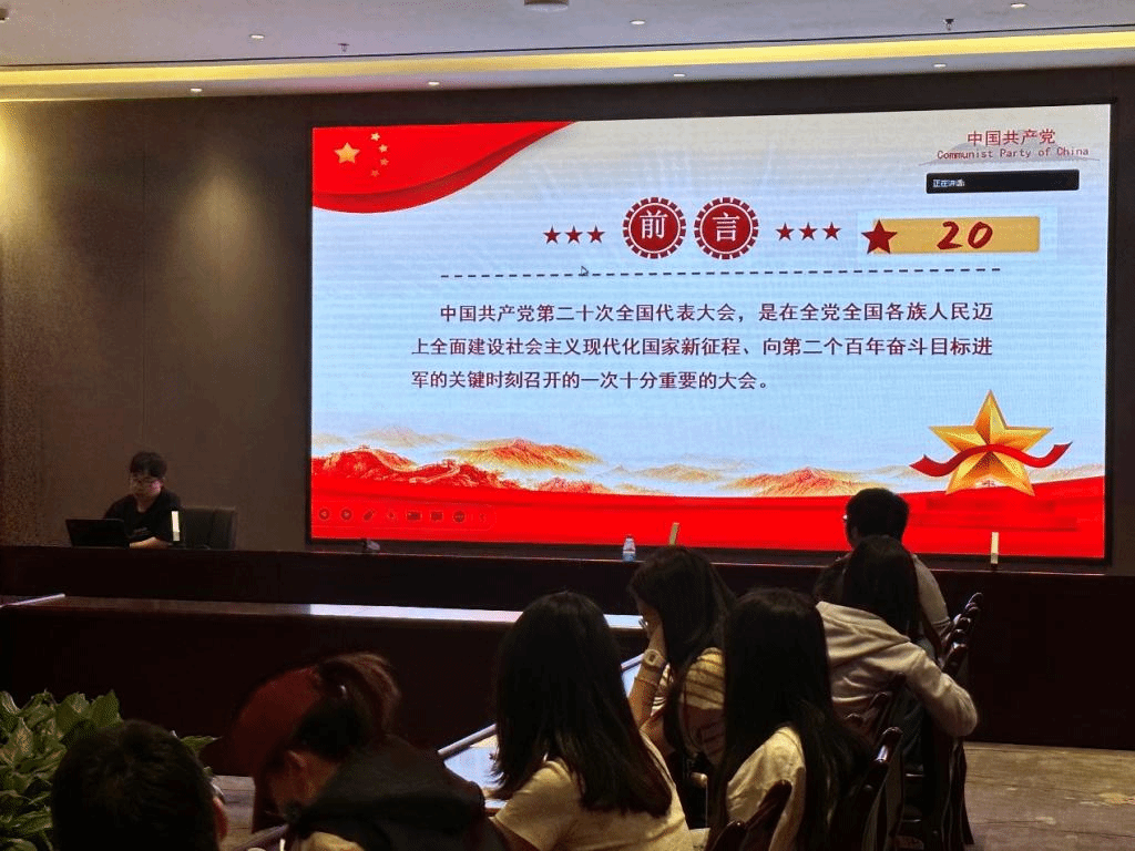 随后,党支部书记为支部党员讲党课。第一党支部书记白晓玉,详细介绍了《习近平著作选读》中有关教育,人才,科技方面的四个章节,带领党支部学习了习近平总书记重要讲话精神,引导支部党员凝心聚魂,为开展实践打好理论基础。第二支部书记张喆,以新发展理念为切入点,以小视频为载体,带领党员们重温了从十八大到二十大新时代十年祖国的伟大变革,激励大家以祖国的发展为指引,坚持贯彻新发展理念,争做新时代优秀青年。第三支部书记周宇凡,以二十大的重大意义,二十大主题与“三个务必”为切入点,通过问答的形式,带领党员们领会党的二十大精神的丰富内涵、精神实质、重大意义。第四党支部书记徐罡讲述了二十大报告中的数字表达,从三件大事,一个中心任务,六个坚持等方面展现党的十八大以来党取得重大理论创造和社会主义建设事业的历史性成就,号召青年党员增长志气、骨气、底气。