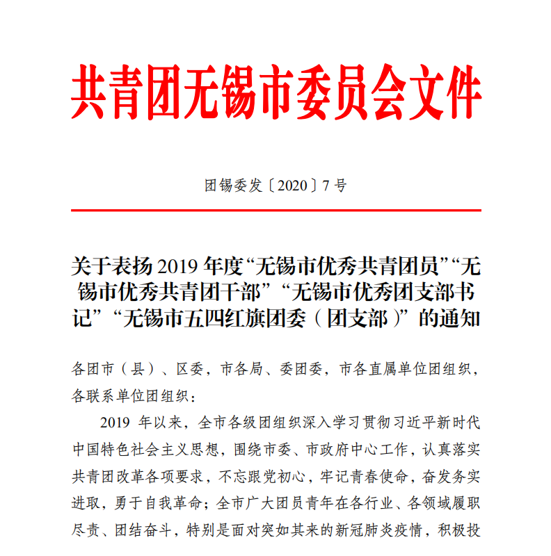 近日,共青团无锡市委员会发布《共青团无锡市委员会关于表扬2019年度“无锡市优秀共青团员”“无锡市优秀共青团干部”“无锡市优秀团支部书记”“无锡市五四红旗团委(团支部)”的通知》,共青团多宝体育官网