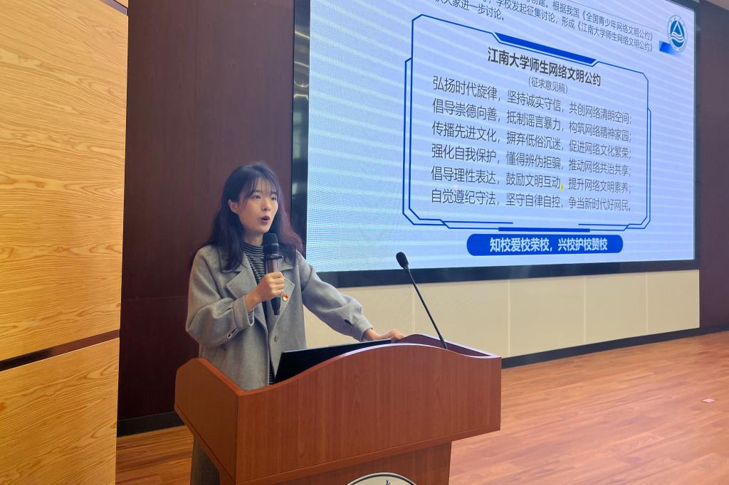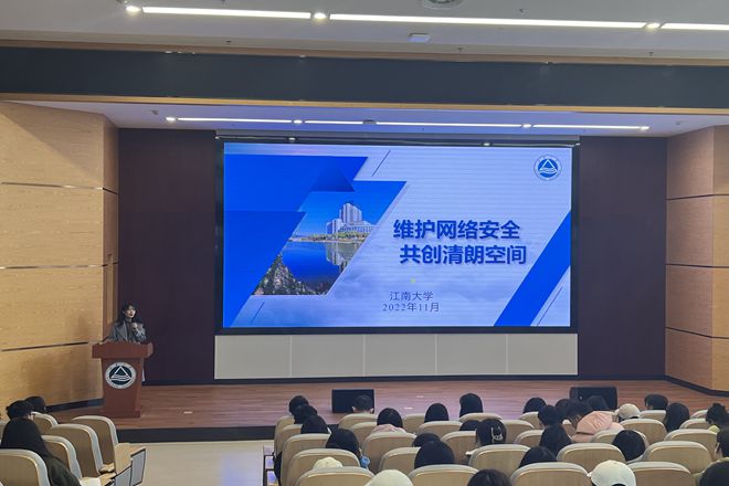于江南大学(东氿校区)清源楼A101报告厅开展“维护网络安全,共创清朗空间”主题教育活动,2022级全体研究生参与本次活动。