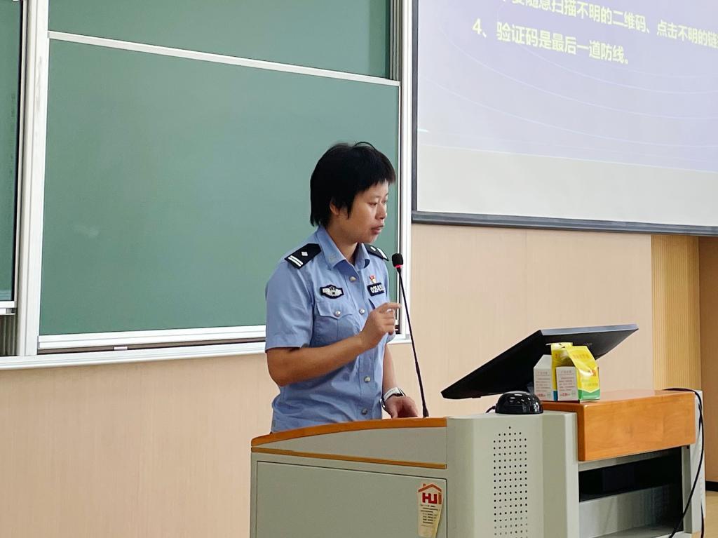 董蕾以校园常见诈骗案例为切入点,展开讲述了电信网络诈骗的定义、基本特征及诈骗产业全链条。她借由近期电影《孤注一掷》深入介绍了缅甸诈骗系列案件。随后,董蕾分析了现实生活中的典型案例及案例数量,并细分为冒充客服、网购退款、网贷、打游戏被骗、刷单诈骗、网恋裸聊、冒充身份等7种不同诈骗方法,剖析诈骗手段,引导学生预判诈骗风险,对网络信息进行客观辨析。最后,董蕾强调,对待电信诈骗,同学们应该做到“不透露,不轻信,不转账”,如果被诈骗,应及时向公安机关反映。