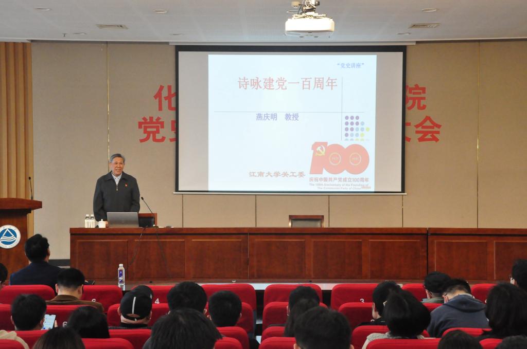 动员大会后,学院全体党员和入党积极分子参加了学院“学党史、悟思想”党史专题培训讲座的第一讲。讲座由原江南大学副校长、校关工委燕庆明教授以“诗咏建党一百周年”为题讲授。燕庆明结合自身学习心得感悟以及工作生活经历,通过20余首自创诗词将南昌起义、遵义会议、长征、延安岁月、抗日救国、第一颗原子弹爆炸成功等一件件历史事件娓娓道来,生动鲜明地讲述了中国共产党人在白色恐怖中寻找救国图存答案、革命斗争中筚路蓝缕、十四年抗战中发展壮大、解放战争中辉煌胜利、改革开放中摸索过河以及中国特色社会主义建设进入新时代以来的伟大成就等历史和现实实践。“理论决定方向,道路决定命运,制度决定成败,文化决定精神,坚定“四个自信”,乘风破浪前进。”随着燕庆明老同志饱含激情的总结,讲座在热烈的掌声中结束,现场师生无不为老同志的这堂课喝彩,为在这堂课上汲取到的前进力量和奋斗激情而信心满满。