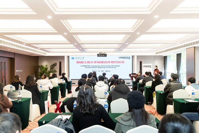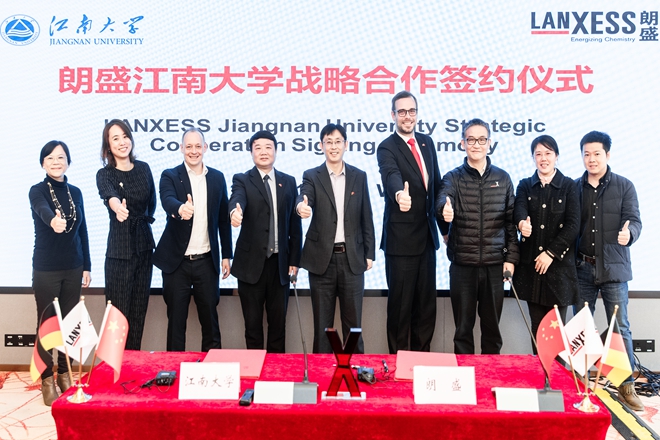 11月25日上午,江南大学-朗盛战略合作签约仪式在我校举行。无锡市人民政府外事办公室副主任詹熠、无锡高新区招商发展中心副主任惠人杰、朗盛化学高性能材料业务部大中华区销售及市场总监兼朗盛(无锡)高性能复合材料有限公司总经理Michael Rockel、朗盛(无锡)副总经理Waihong Loh、朗盛(常州)总经理兼朗盛大中华区技术创新总监胡东祺、朗盛化学亚太区企业传播负责人Ulf Drssler,多宝体育