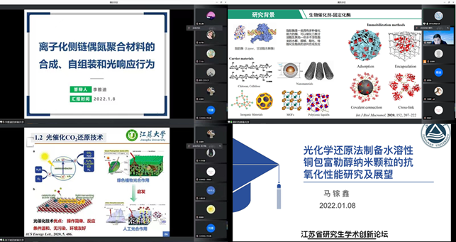 开幕式结束后,大会邀请东南大学游雨蒙教授、苏州大学康振辉教授、江南大学蒋建中教授分别做了题为:具有钙钛矿结构的分子铁电材料、Carbon Dots Promise New Photoelectrocatalysts、表面活性剂与纳米颗粒在流体界面自组装的高水平学术报告,拓宽了参会研究生的学术思维。当天下午,来自各校的研究生代表根据自身研究内容,前往各个分论坛做了关于化学化工新技术、高分子材料、功能材料等相关领域的线上学术报告,报告内容详实,具有较高的前沿性,充分体现了各学子在化工新材料领域的创新思维。