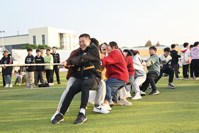 在操场中央的草坪上,团体项目也在如火如荼地进行着。背对背夹球跑、单足跳接力、八字跳绳等项目让同学们都积极参与其中。各位同学协调分工,团结一致,体验到了运动的乐趣。最后的项目是拔河比赛,此时天空被夕阳染成了血红色,现场的氛围也像炽热的火焰,每位同学都铆足了劲,向着胜利出发。