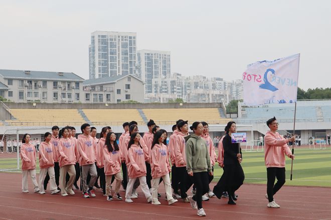 在雄壮激昂的乐曲声里,迎着初升的朝阳,国旗护卫队和院旗护卫队迈着矫健步伐走过主席台。紧随其后的是各新生班级方阵与社团方阵,他们信心满怀,精神抖擞。伴随着音乐的响起,他们跳动轻快的脚步,挥洒舒放的手臂,扭动柔活的腰身,绽放灿烂的笑容,展示着运动中的美丽,显示出新一代的蓬勃生机。