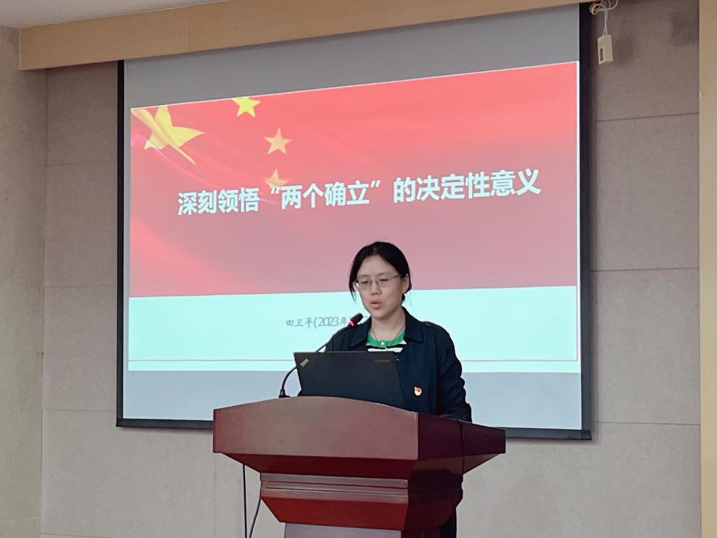 田卫平带领学院全体教职工从理论维度学习“两个确立”是马克思主义政党的重大建党原则的观点。她引用马克思在《1848年至1850年的法兰西阶级斗争》、列宁《论无产阶级政党》等经典论著中的论断,指出“马克思主义政党不可没有领袖,也不可没有中央权威”“坚强的领导核心和科学的革命理论问题,始终是马克思主义建党学说的核心问题”。“两个确立”的形成充分体现了中国共产党对马克思主义建党学说的深刻把握,充分彰显了党作为马克思主义政党增强理论自觉、把握关键问题的智慧与本领。其次,田卫平副部长从历史思维角度指出“两个确立”是我们党百年奋斗的重大历史启示。她引用《邓小平文选(第三代领导集体的当务之急)》《中共中央关于加强党的建设几个重大问题的决定(1994年9月党的十四届四中全会通过)》《中国共产党的历史使命与行动价值》《中共中央关于党的百年奋斗重大成就和历史经验的决议》等党的重要文献指出:“100年来,党之所以能够统一思想、步调一致向前进,根本原因就是形成了坚强有力的领导核心:党不断发展壮大,克服重重艰难险阻而立于不败之地,党的领导核心发挥了独特的,不可替代的作用。历史和现实充分表明,全党有核心,党中央才有权威,党才有力量。”随后,田卫平副部长详细列举了新时代十年我们党带领全国各族人民所取得的历史性成就和历史性变革,从现实维度证明了“两个确立”是推动党和国家事业在新时代取得历史性成就、发生历史性变革的决定性因素。坚持不懈用习近平新时代中国特色社会主义思想这一创新理论武装头脑、指导实践、推动工作,则为新时代党和国家事业发展提供了根本遵循。在实践维度视角,田卫平副部长从“民主与集中、领袖与群众、权力与责任”三者的关系介绍了如何科学把握“两个确立”的内涵实质,从“紧紧抓住一个根本、坚决做到两个维护、不断提高政治三力”点出了全面贯彻“两个确立”的实践要求。