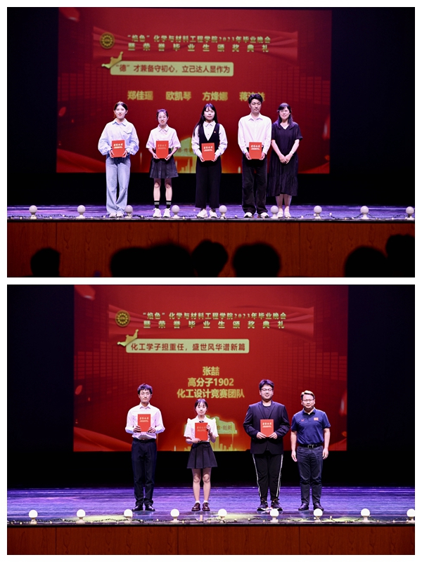 乐队开场表演后,首先进行荣誉毕业生颁奖典礼。颁奖分为“德才兼备守初心,立己达人显作为”“智周万物勤砥砺,自强不息勇争先”“体育精神远名扬,青春弄潮有力量”“美才爱美多才艺,美丽事业欣向荣”“劳动养体亦养德,青年学习亦修心”“化工学子担重任,盛世风华谱新篇”六个部分,对在“德智体美劳”方面表现突出的个人和集体授予荣誉毕业生称号,为张喆、高分子1902班、化工设计竞赛全国特等奖获得者-孚美队授予“风华荣誉毕业生”最高荣誉。