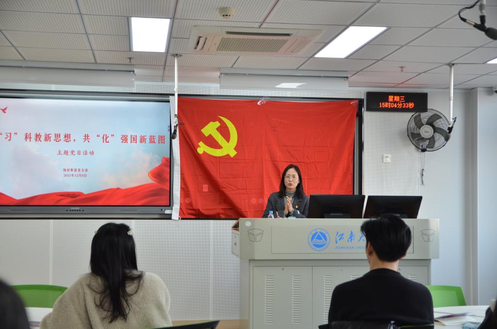 党的二十大报告指出,“必须坚持科技是第一生产力,人才是第一资源,创新是第一动力”。为深入学习贯彻习近平总书记关于教育科研工作的新思想,进一步学习和弘扬科学家精神,12月6日,化工学院纳材聚能研究生党支部开展“学‘习’科教新思想,共‘化’强国新蓝图”主题党日活动,旨在培养研究生党员们矢志爱国,唯真求实的科研精神,共同探讨研究生党员在科研路上如何发挥榜样力量。江南大学党校常务副校长兼党委组织部副部长周雪晖同志莅临指导,化工学院党委副书记董霞同志、课题组导师张旭副教授、党委秘书张青以及辅导员李晓洁出席本次活动。