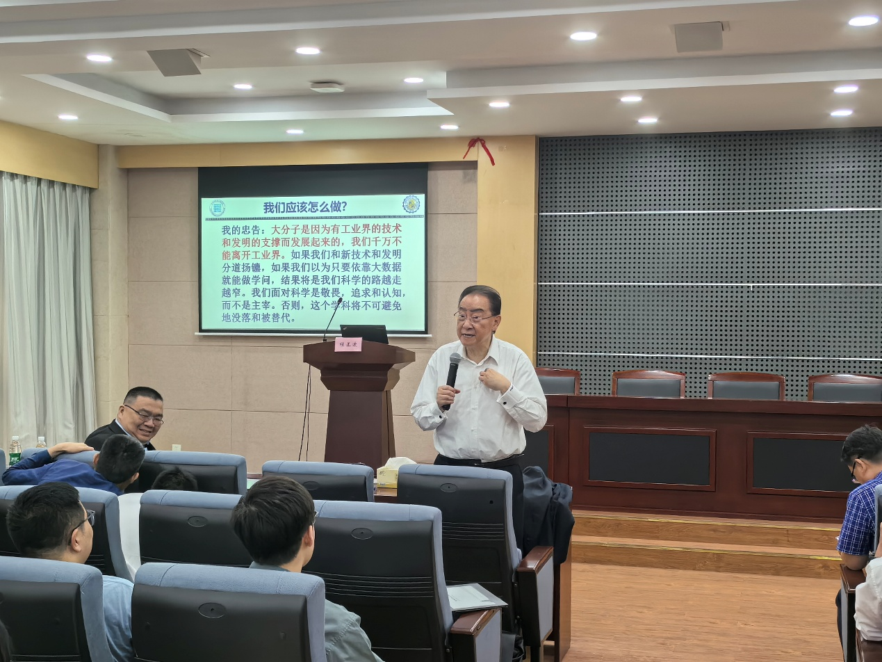 报告会上,程院士以宏观视角梳理了高分子科学百年发展脉络,通过详实案例解析了高分子材料对现代工业与生活的革命性影响。围绕学科发展面临的五大核心挑战——重构高分子定义、发掘新现象、突破材料创新、革新工艺方法、提升表征技术,他提出“创新方法论”的解决路径。在谈及人工智能与大数据技术时,程院士强调:“智能化工具可大幅提升科研效率,但无法替代科学家对实验数据的直觉感知和工程师的实践智慧”,其精辟见解引发在场师生的深度思考。在系统阐述高分子学科发展脉络的同时,程院士更以学者风范传递治学智慧。当论及科研创新时,他援引“敢于走到荆棘满地的地方去挖掘”的探索精神,强调“要做与别人不一样的东西”的原创追求;谈及人才培养时,提出“教育学生从平凡到优秀,从优秀到出类拔萃,才是我们能力的体现”的育人理念。程教授将材料科学规律与人才培养哲学融会贯通的讲述方式,让在座师生既领略到学术泰斗的科研格局,更感悟到“立天地正气,做儒雅学问”的价值追求,为青年学者突破思维定式、实现科研跃迁注入了强大精神动力。