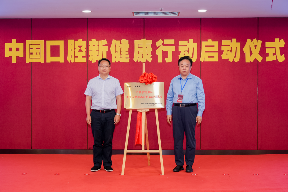现场嘉宾以及美加净、舒客、冷酸灵、云南白药、佳洁士、欧乐-B、高露洁、两面针、Fe金典、诺和新元、确成股份等“中国口腔新健康行动”公益支持方代表,共同启动了“中国口腔新健康行动”按钮。随后,中国口腔清洁护理用品工业协会与江南大学联合共建的“口腔护理用品专业人才培养与职业培训基地”正式揭牌。该基地将整合行业协会资源、高校科研力量与企业实践平台,构建“科普教育—人才培养—技术应用”全链路体系,为行业提供人才储备与技术支撑。