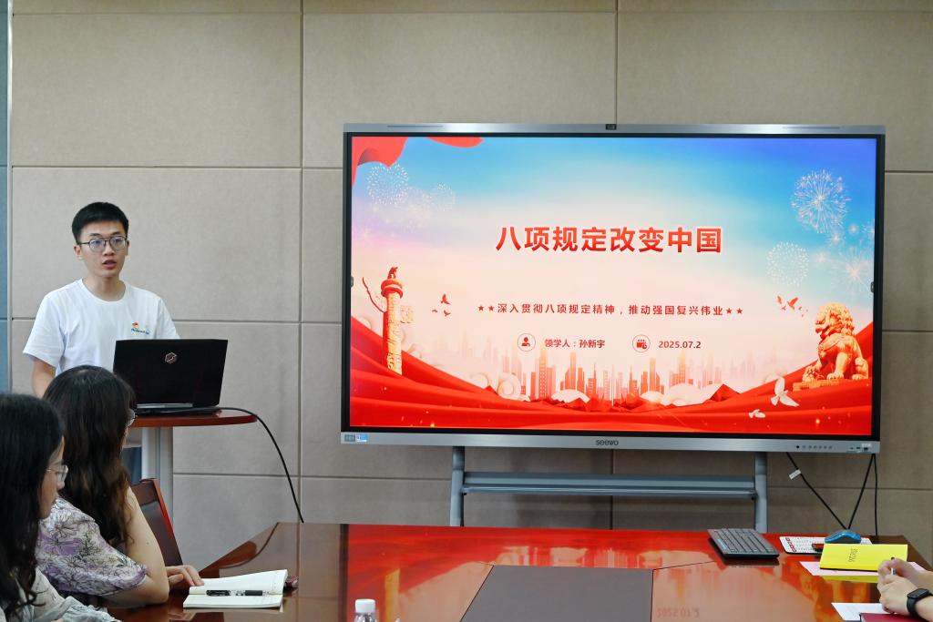 支部纪检委员孙新宇同志以《八项规定改变中国:深入贯彻中央八项规定精神,推动强国复兴伟业》为题进行领学。从井冈山时期毛主席定下的“一根灯芯”规矩,到社会主义革命和建设时期提出的“六条规定”,再到中国特色社会主义新时代习近平总书记主持通过的“中央八项规定”,深入阐述了党风建设的历史脉络与现实意义,展现了中国共产党百年来一以贯之的作风建设决心。他还结合典型案例,阐释了中央八项规定及其实施细则精神,以案说纪、以案说法、以案说责,引导支部党员意识到深入贯彻中央八项规定精神不仅是党员干部的政治任务,更是青年党员坚定理想信念、提升思想自觉的重要路径。随后,全体党员共同观看了专题视频《八项规定改变中国:党在新时代的徙木立信之举》,进一步增强了大家对中央八项规定精神的理解和认识。