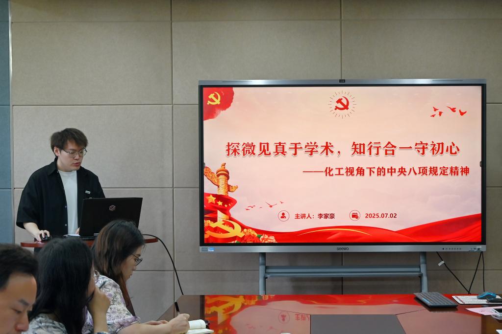 本次党日活动以专业视角解读政策、以实践行动巩固信念、以青年视角凝聚共识,深化了博士生党员对中央八项规定精神的理解和认识,号召支部成员在追求学术创新的同时恪守学术道德,弘扬清廉务实之风。未来,博士生第二党支部将继续以中央八项规定精神为指引,把作风建设成效转化为科研创新与社会服务的强大动能,为祖国化工产业发展和教育强国建设贡献江南化工青年的先锋力量。