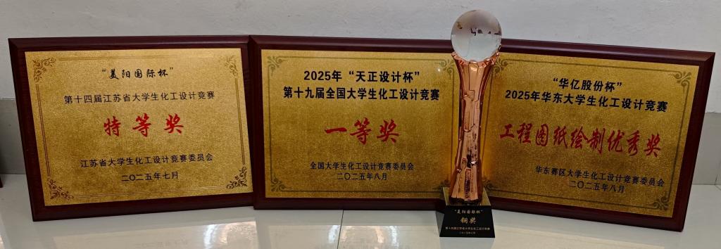 “极净之砜”队的作品《中国石化茂名石化公司年产2万吨DMSO项目》(参赛队员:赖炜键、刘利坤、曾诺恒、王怡敏、刘婷;指导老师:钮腾飞、倪邦庆、张薇、章佳威)历经江苏省省赛、华东赛区选拔赛和全国总决赛的激烈角逐,以及五位队员在答辩现场的优异表现,最终获江苏省特等奖(铜奖)、华东区特等奖以及全国一等奖。