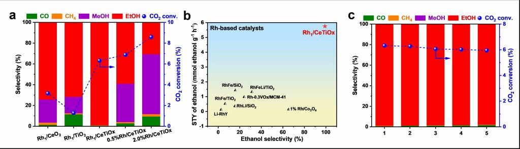 图1. Rh1/CeTiOx催化剂催化CO2加氢一步制乙醇