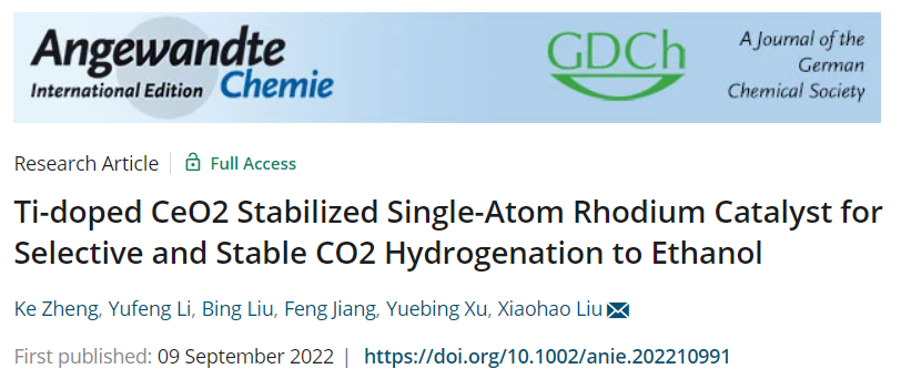 这一成果近期以题为“Ti-doped CeO2Stabilized Single-Atom Rhodium Catalyst for Selective and Stable CO2Hydrogenation to Ethanol”发表在Angewandte Chemie International Edition期刊上。江南大学化工学院博士研究生郑珂和李玉峰为文章的共同第一作者,江南大学化工学院刘小浩教授为文章的通讯作者。上述工作得到国家自然科学基金(21706098,21576119, 21878127)等项目的资助。