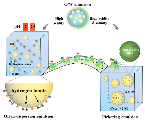 乳状液广泛应用在日常生活、工农业生产等多个领域,然而乳状液的稳定性常常受到体系中的酸碱或者盐含量的影响。在一些特殊应用场合中,如油田开采、强酸性废水处理等领域,往往存在强酸、高盐、或者强酸与高盐同时存在的情况,从而造成乳状液的稳定性下降或者破乳。如何使乳状液在强酸、高盐等苛刻条件下保持长时间稳定是一项巨大的挑战。