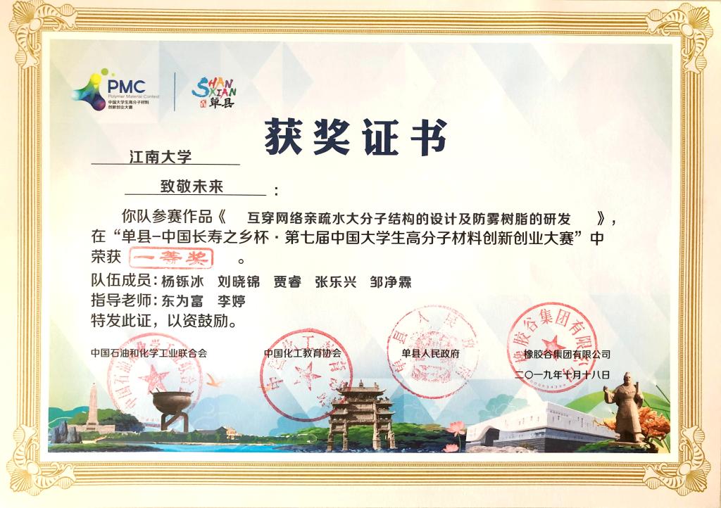 第七届中国大学生高分子材料创新创业大赛(PMC)一等奖