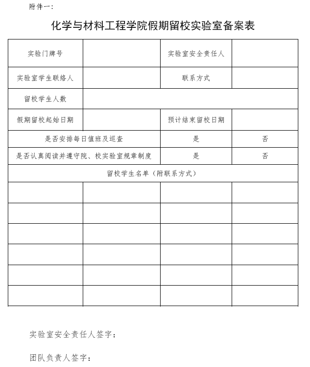 假期留校实验室备案表》(附件一),人员进出入要做好登记。实验室内至少两人同时在场才可开展实验工作,遵守实验室的各项规定,严格执行相关的操作规程,做好个人防护工作。所有人员离开之前请做好“四防、四关”工作,四防即防火、防盗、防破坏、防灾害事故,四关即关好门窗、水、电、气。