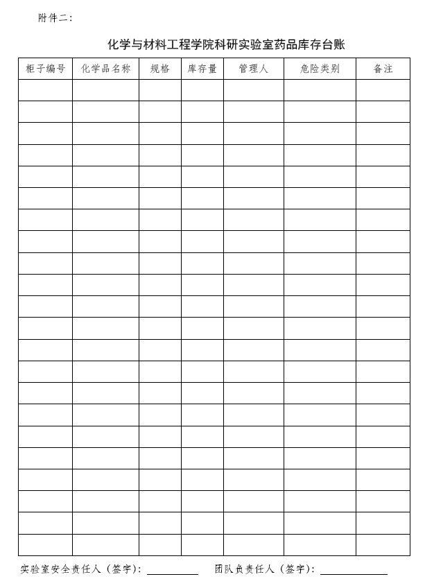 5.易制毒、易制爆、易燃(如乙醇、石油醚、乙醚)等危险化学品的领用不可超量,领用后妥善保管于试剂安全柜中,并及时做好使用台账以及学期末的药品库存台账(附件二)。如有假期不使用的过量危险化学品请寄存到校危险品仓库。