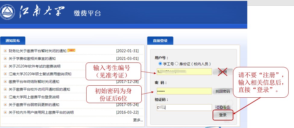 申请考核考生登录“江南大学网上缴费平台” (网址://pay.duobaosport.net/payment/)或搜索微信公众号“江南大学财务处”,在“业务办理”中选“学生缴费”,硕博连读考生无须缴费。